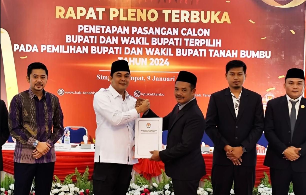 Tanah Bumbu – Komisi Pemilihan Umum (KPU) Kabupaten Tanah Bumbu resmi menetapkan pasangan Andi Rudi dan H. Bahsanuddin sebagai Bupati dan Wakil Bupati terpilih dalam Pemilihan Kepala Daerah (Pilkada) 2024. Penetapan ini diumumkan dalam rapat pleno terbuka yang digelar pada di Mahligai Bersujud, Kapet, Kecamatan Simpang Empat, Kamis (9/1/2025).