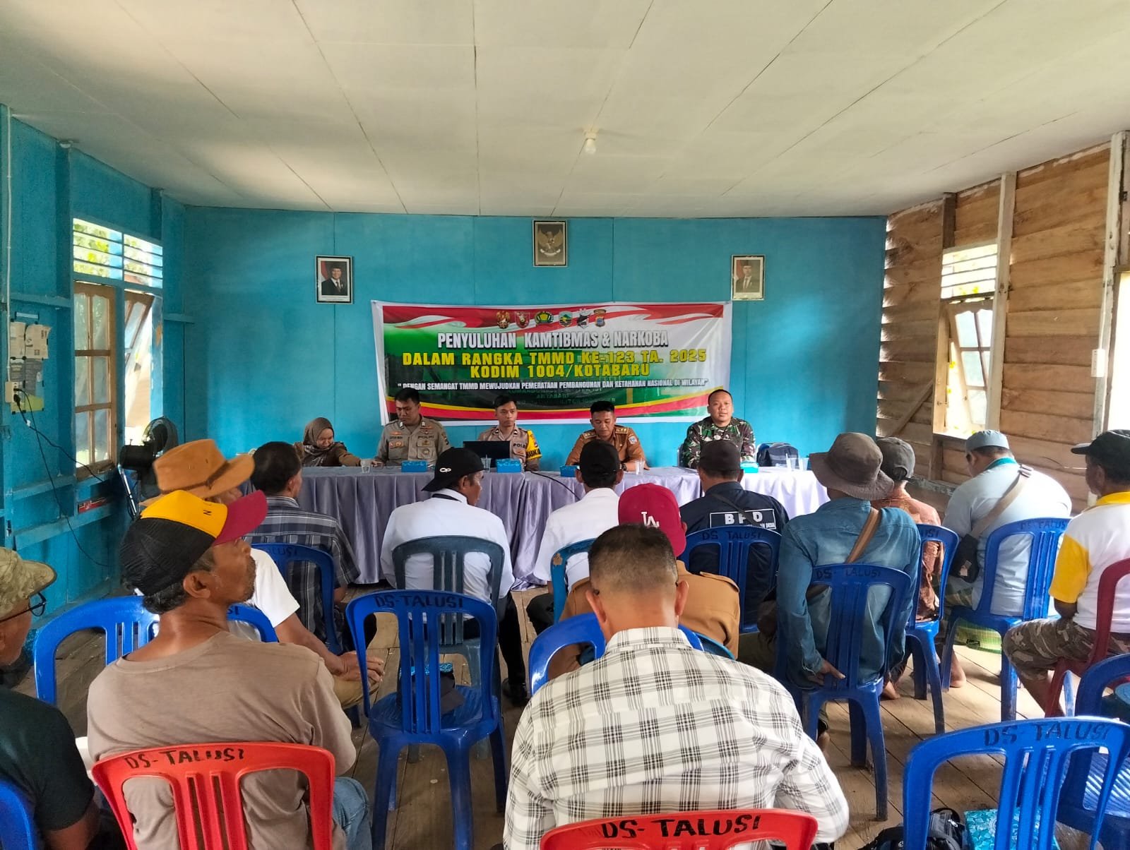 Suarawan, Kotabaru – Satuan Tugas (Satgas) Tentara Manunggal Membangun Desa (TMMD) ke-123 Kodim 1004/Kotabaru bersama Polsek Pamukan Selatan menggelar sosialisasi keamanan dan ketertiban masyarakat (Kamtibmas) serta pencegahan penyalahgunaan narkoba di Desa Talusi, Kabupaten Kotabaru.