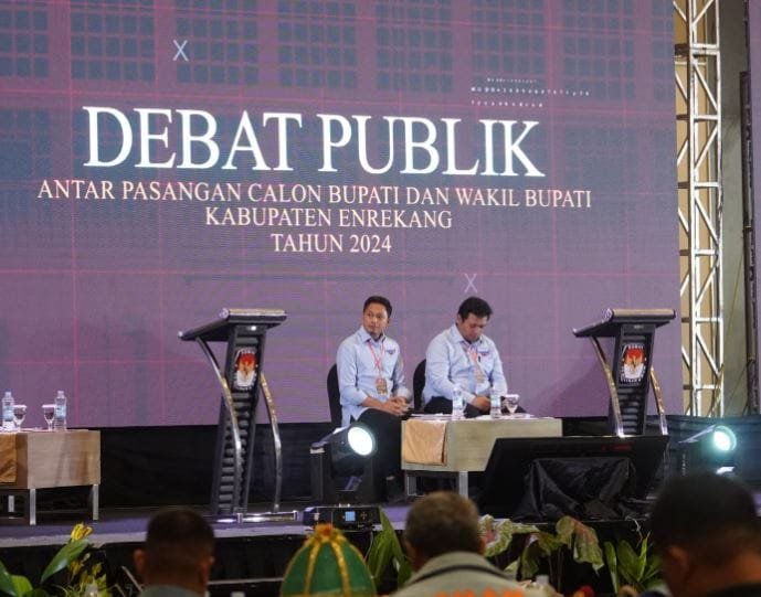 MAKASSAR – Cabup 02, Andi Tenri Liwang La Tinro, menutup penampilan paslon UCU-IWAN pada sesi penyataan penutup (closing statement) Debat Publik Kedua Pilkada Enrekang dengan membacakan pantun yang menyindir kondisi keuangan Enrekang yang buruk karena terlilit utang Rp700 miliar.