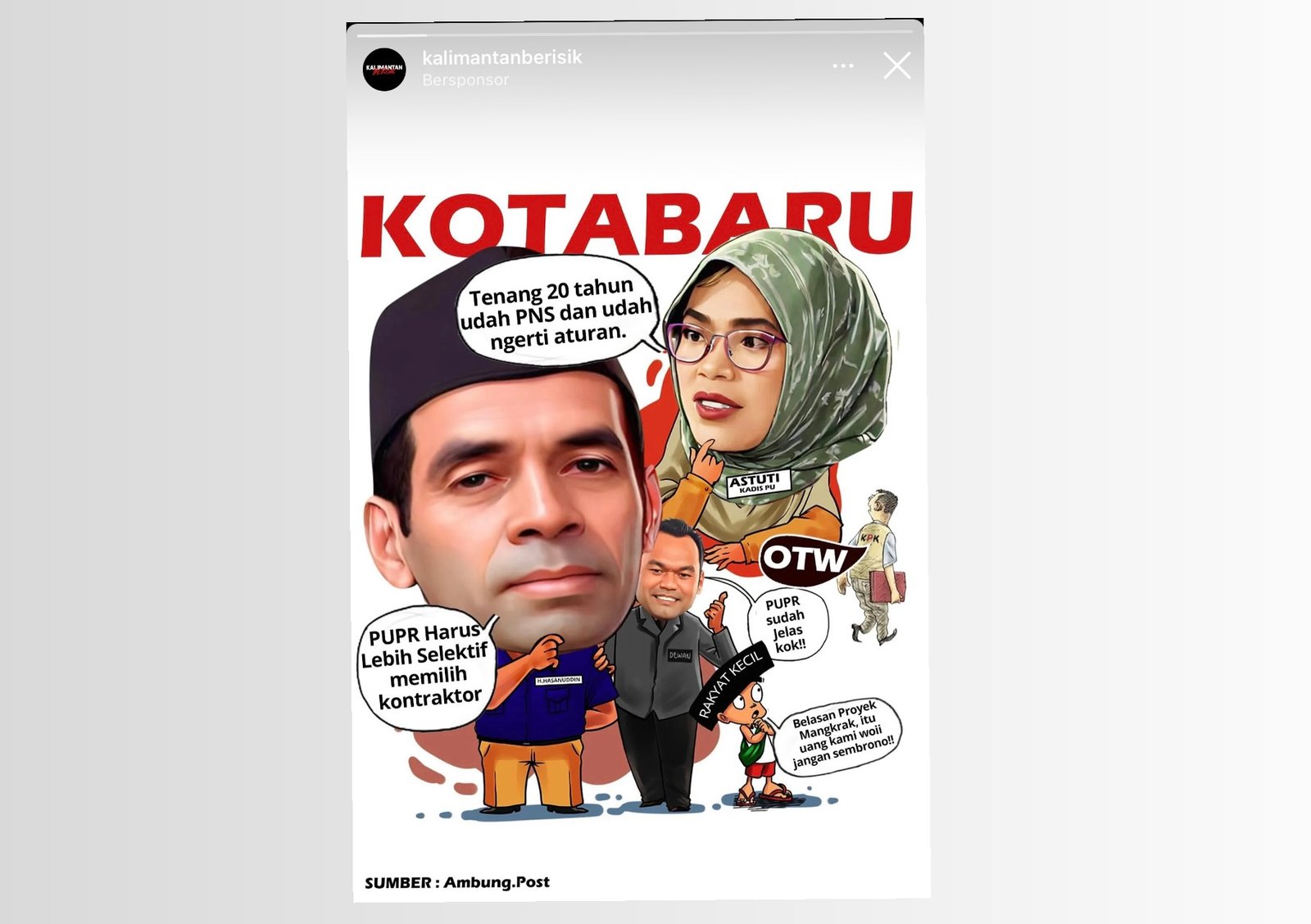 Suarawan, Kotabaru – Maraknya postingan akun media sosial terkait sejumlah proyek di Kotabaru yang bermasalah. Salah satunya gambar Karikatur Kadis PUPR dan Anggota DPRD Kotabaru yang bersileweran di jagad media sosial.