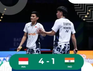 Suarawan – Ganda putra Indonesia Muhammad Shohibul Fikri/Daniel Marthin sukses menjadi penentu kemenangan tim Merah Putih atas India dalam laga