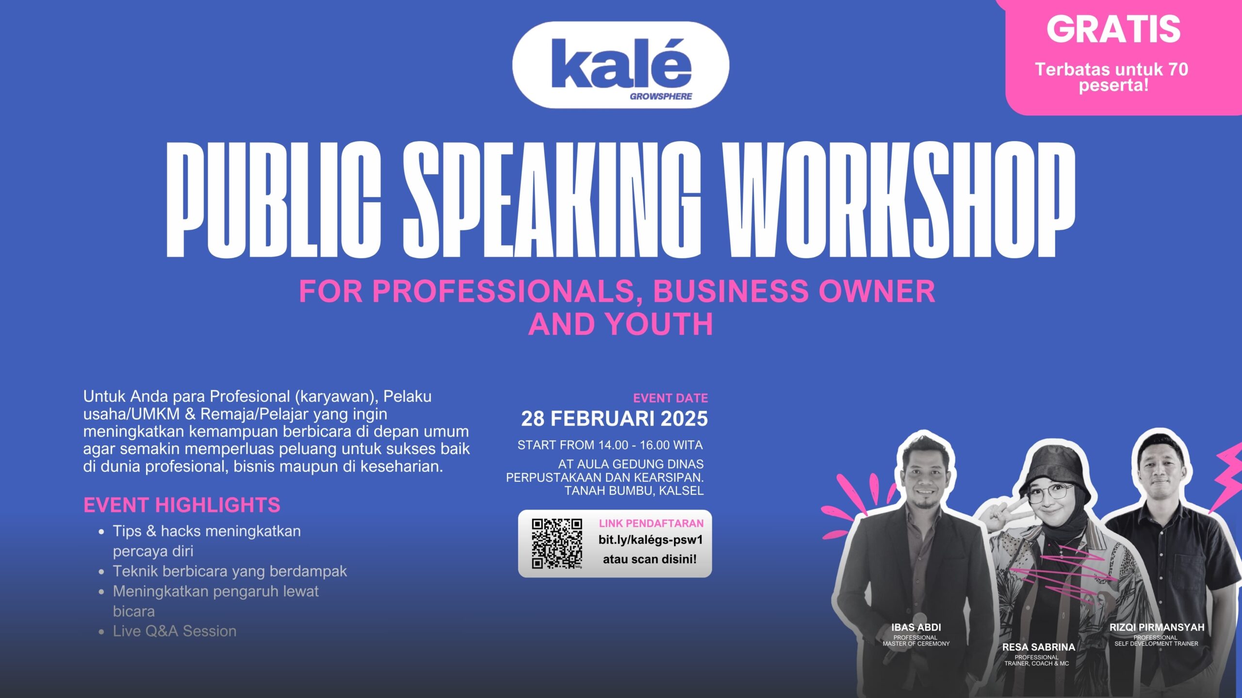Suarawan, Tanah Bumbu – Kale Growsphere akan mengadakan workshop public speaking gratis untuk 70 peserta dengan tujuan meningkatkan kemampuan berbicara di depan umum.