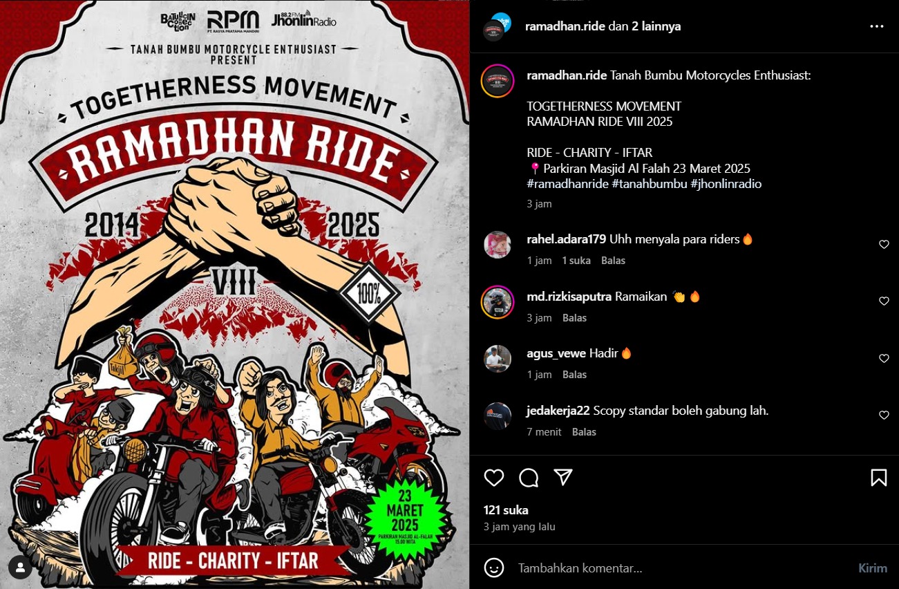 Kegiatan ini akan dimulai di Parkiran Masjid Al Falah tanggal 23 Maret 2025.Untuk informasi lebih lanjut, para peserta dan masyarakat dapat mengunjungi akun Instagram @ramadhan.ride.