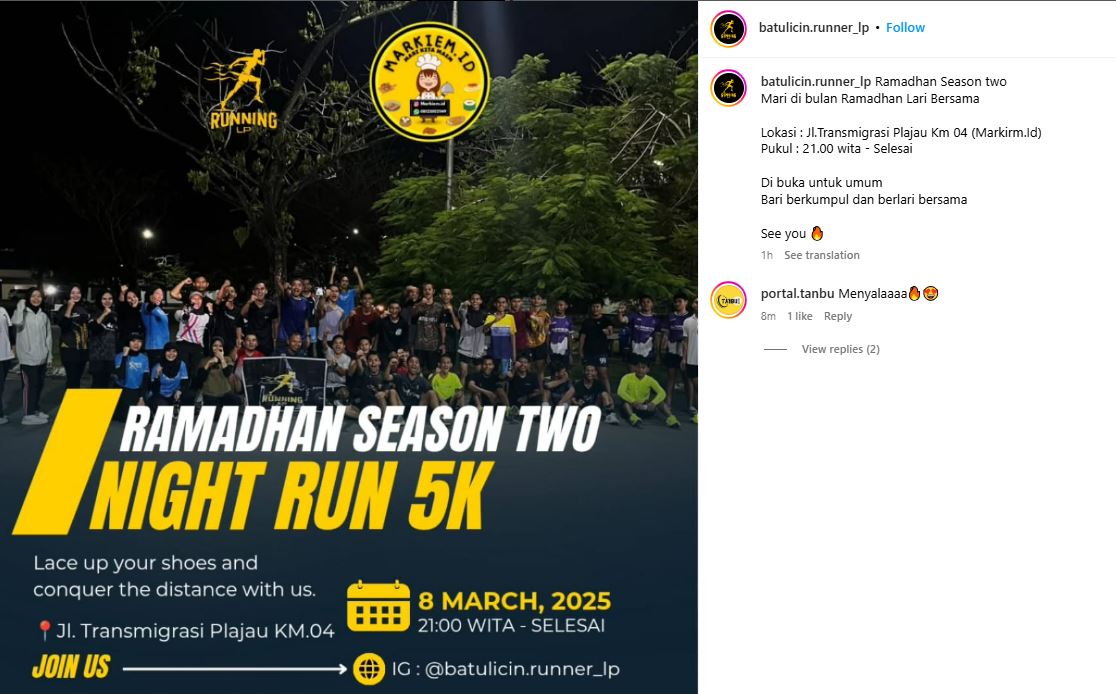 Untuk informasi lebih lanjut, masyarakat dapat mengunjungi akun Instagram @batulicin.runner_lp